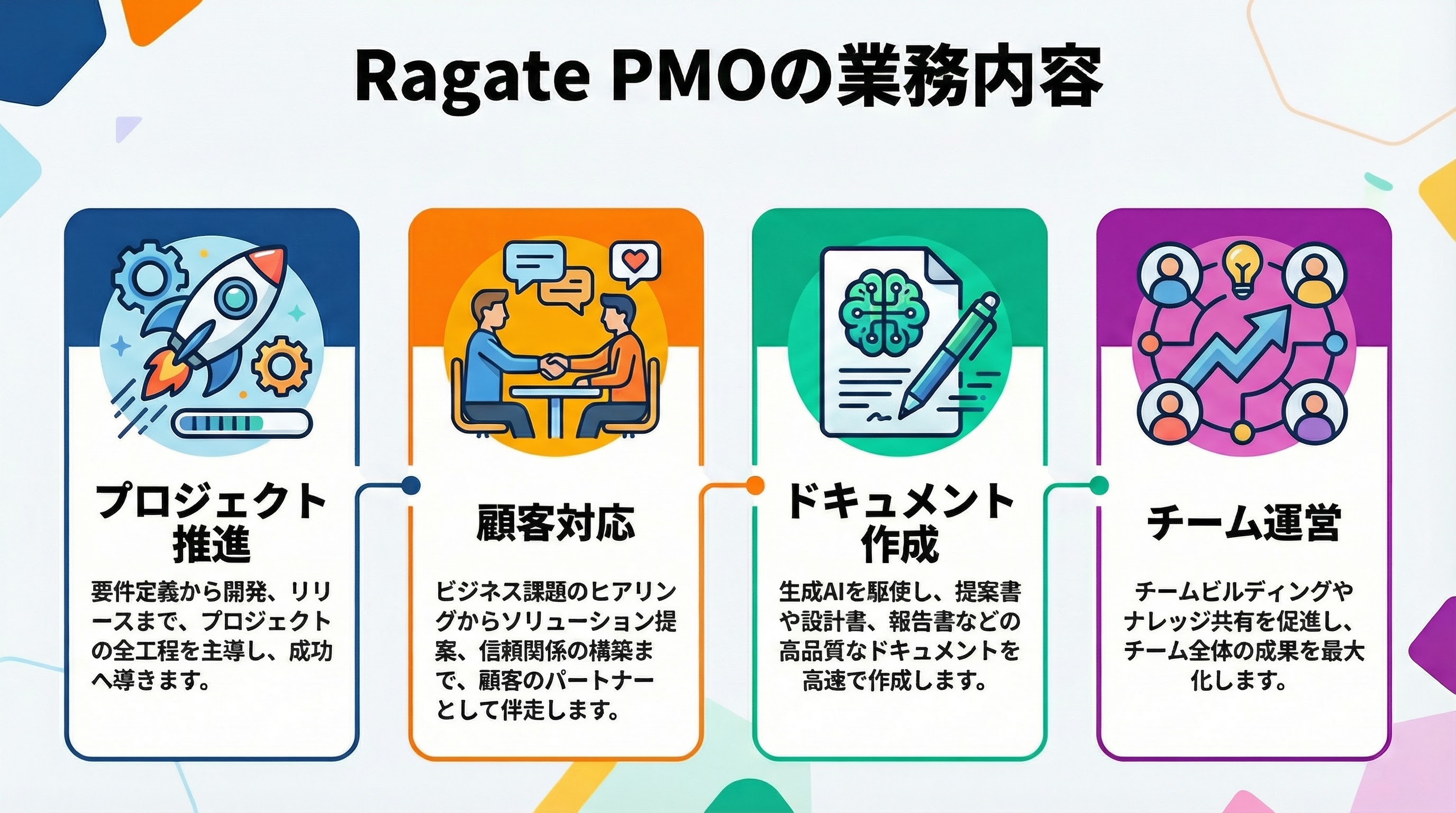 RagateのPMOは、従来の進捗管理やドキュメント作成を主務とする管理者像とは一線を画します。