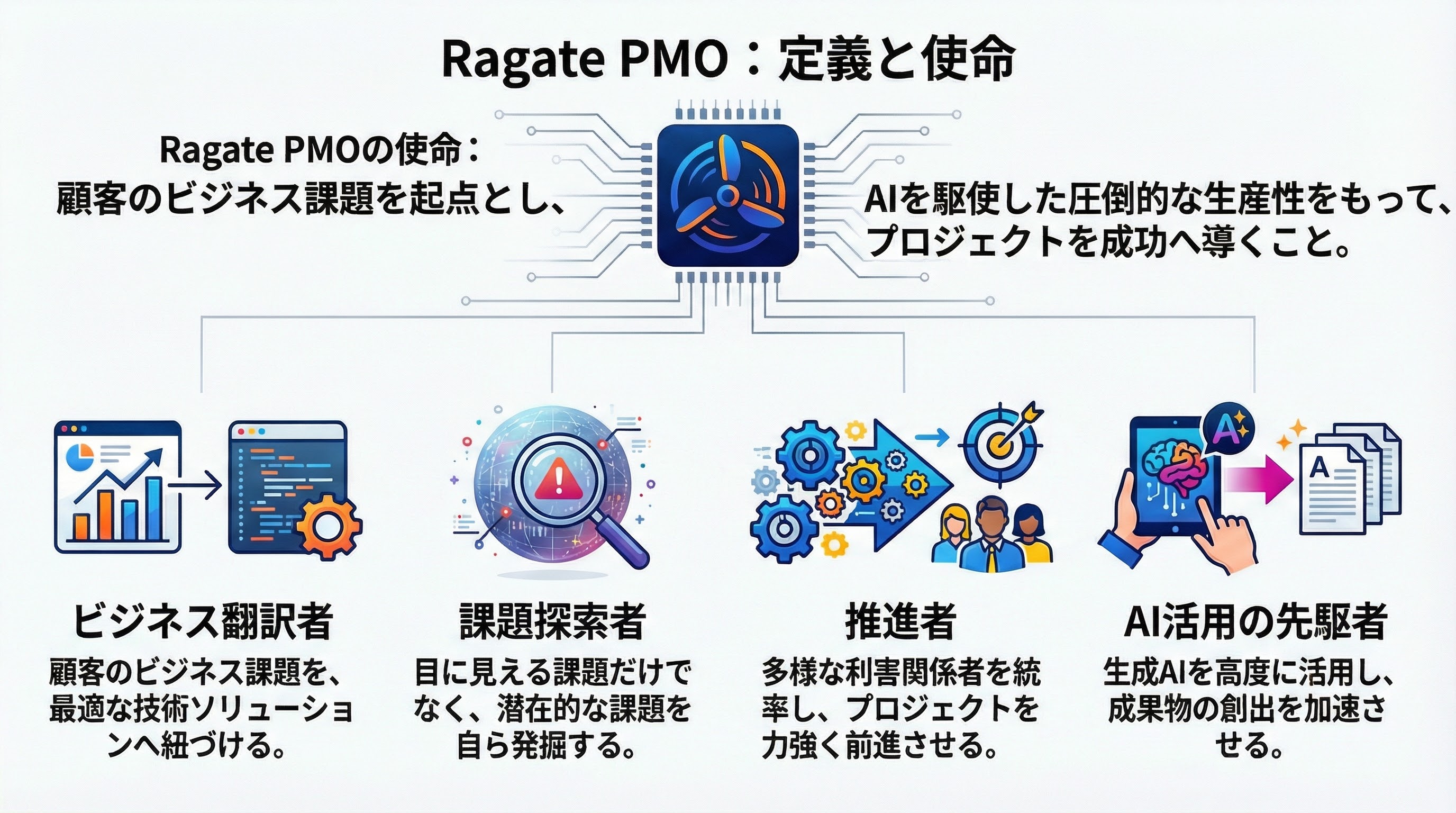 Ragate PMOの使命:顧客のビジネス課題を起点とし、AIを駆使した圧倒的な生産性をもって、プロジェクトを成功へ導くこと