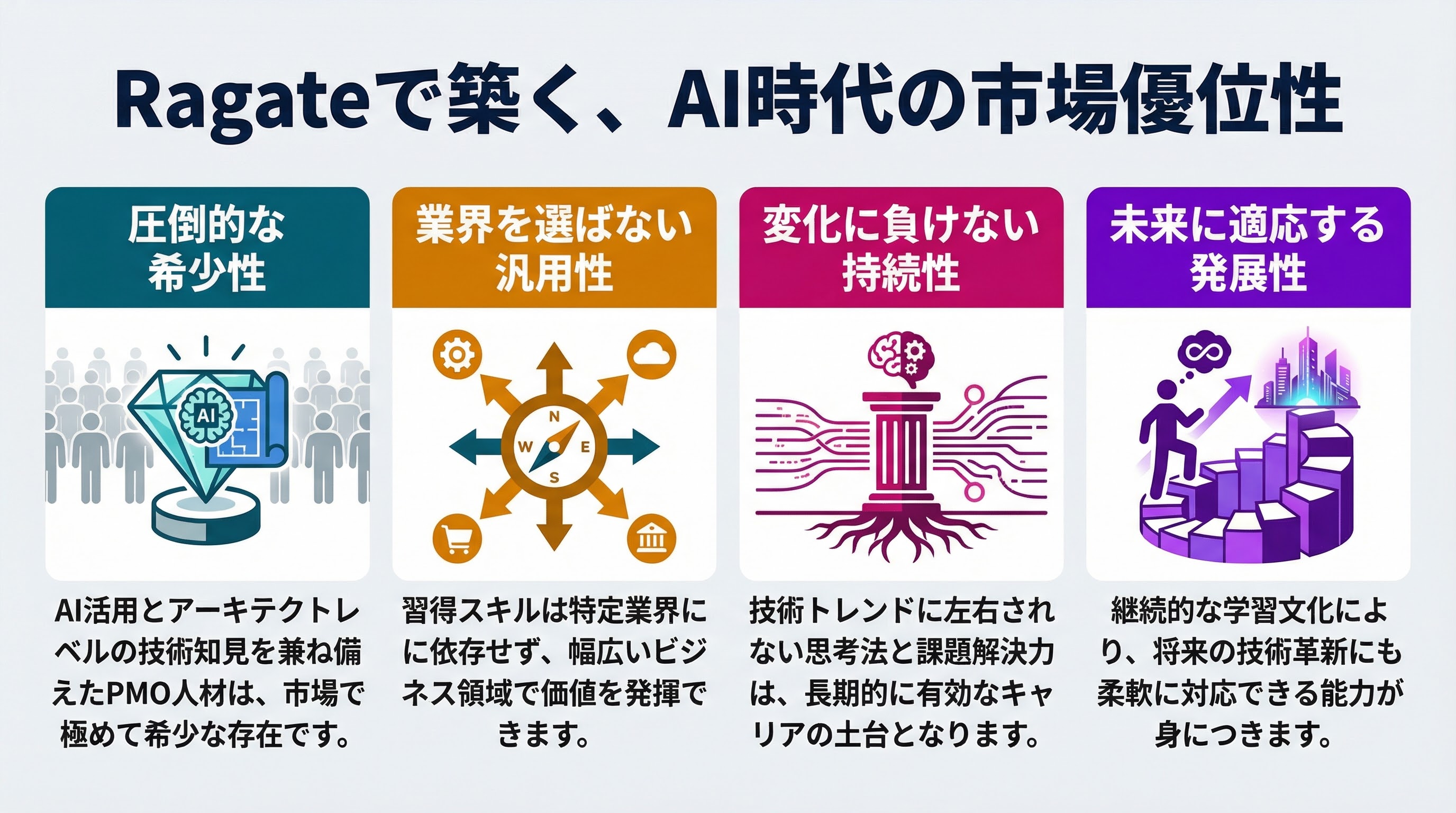 Ragate PMOとしての経験は、以下の市場優位性をもたらします。