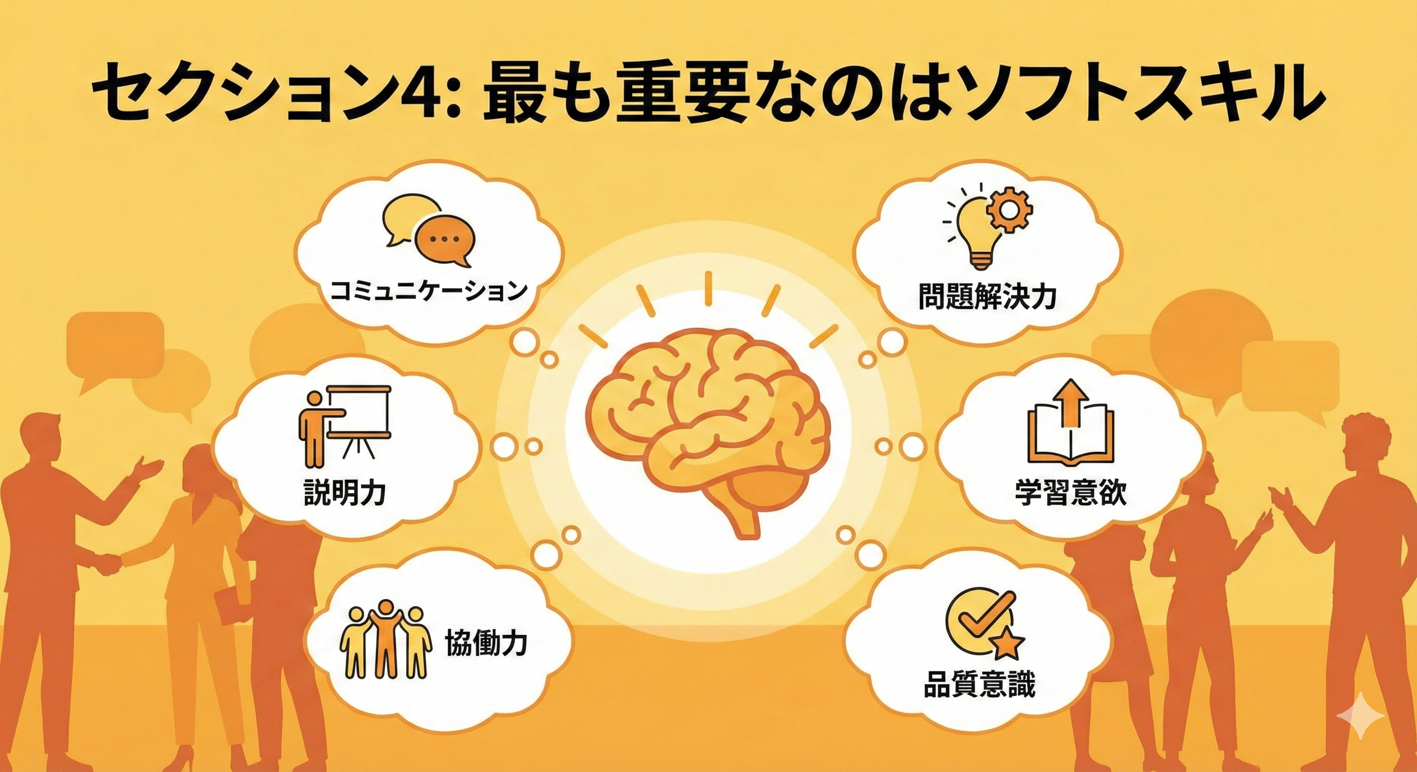 Ragateエンジニアにおいて、ソフトスキルは技術スキルと同等以上に重視される能力領域です。エンジニアは技術の専門家ですが、チーム内での協働、顧客との対話、技術的意思決定の説明など、技術以外の能力も重要です。
