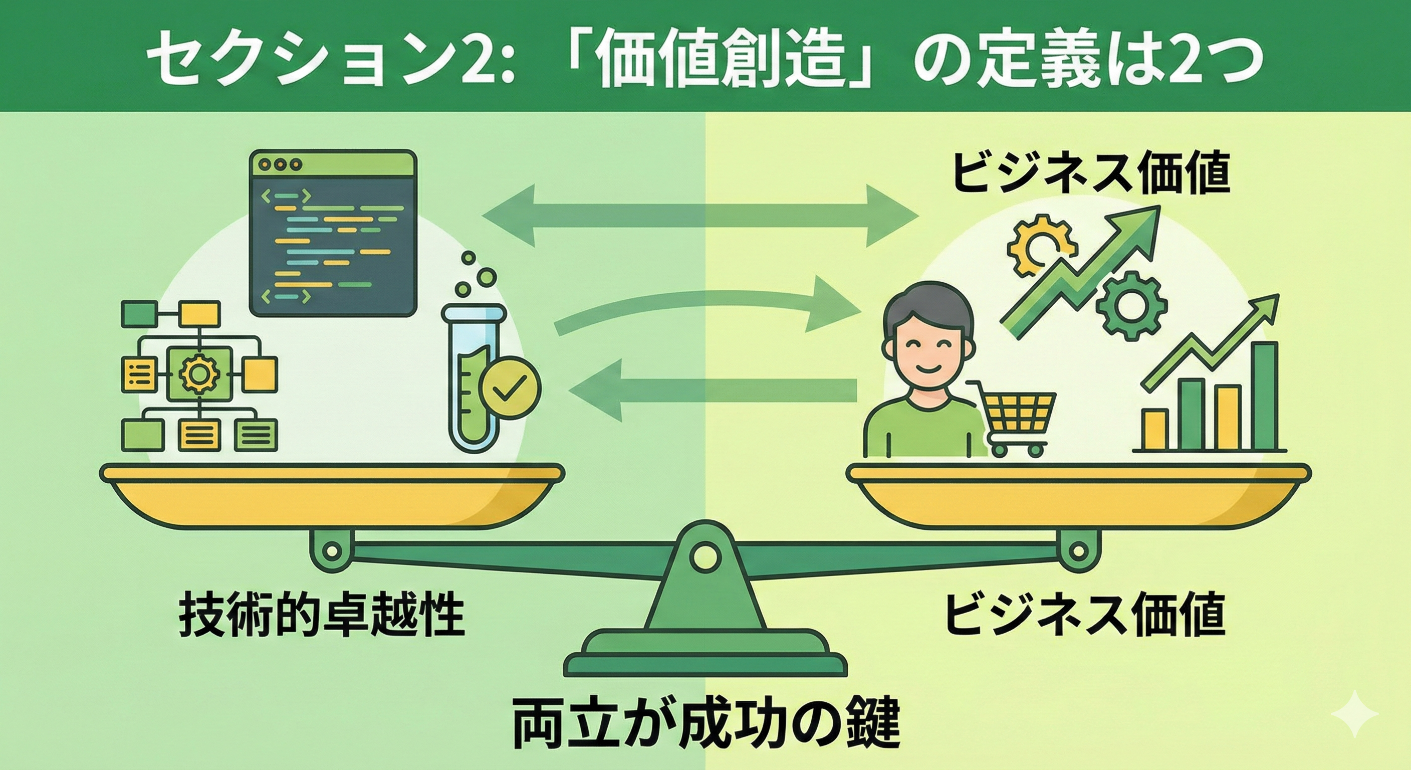 単に技術的に優れたシステムを構築するだけでは不十分です。顧客のビジネス目標を理解し、技術を通じて真の価値を提供することが求められます。逆に、短期的なビジネス目標に迎合するだけで、技術的負債を蓄積することも避けるべきです。