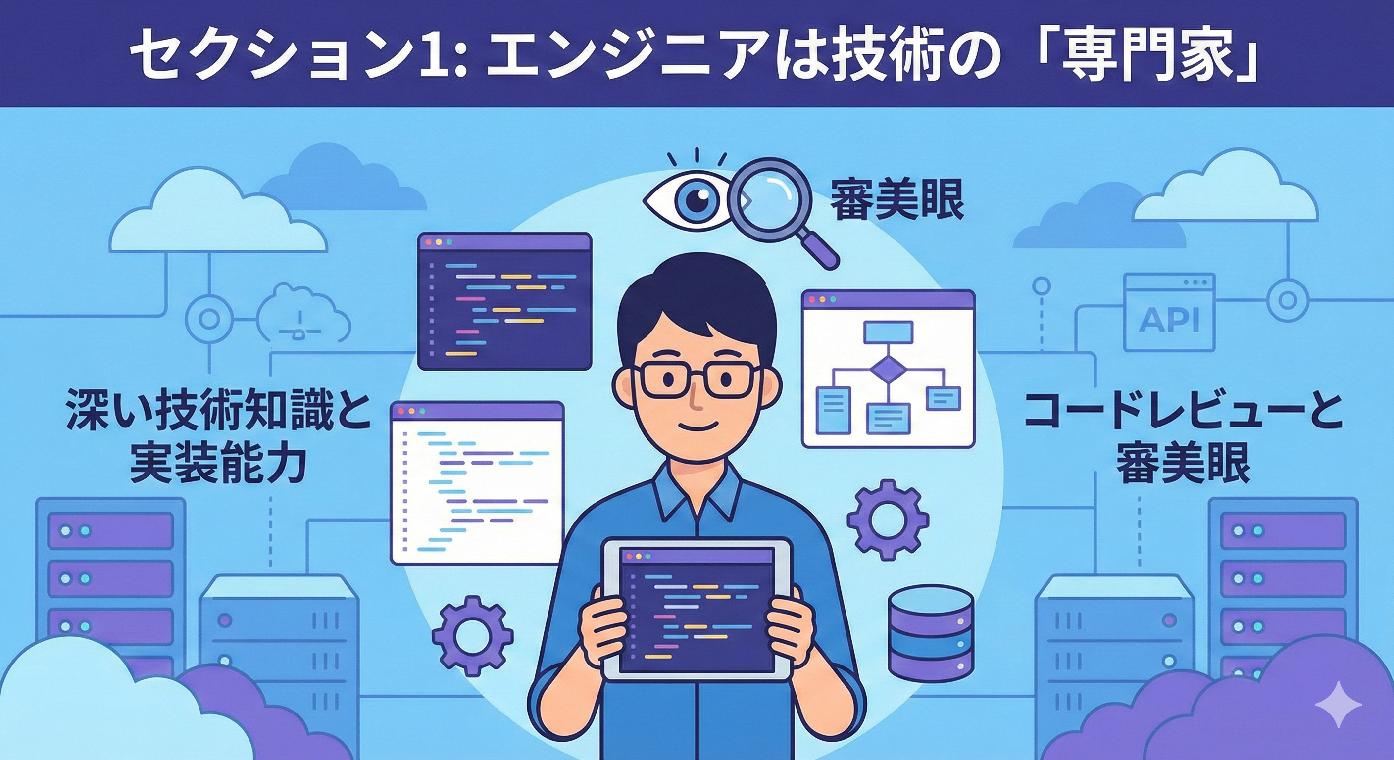 専門性 | 実装能力、技術知識 | 深い技術知識と実装能力に加え、コードレビューや実装内容の正しさを判断する審美眼 |