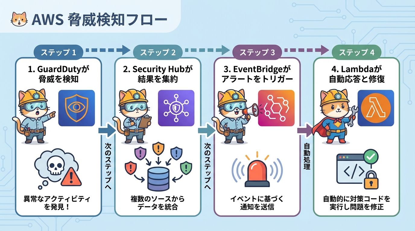 この連携フローを理解することが、AWSでの能動的防御実装の第一歩です。
