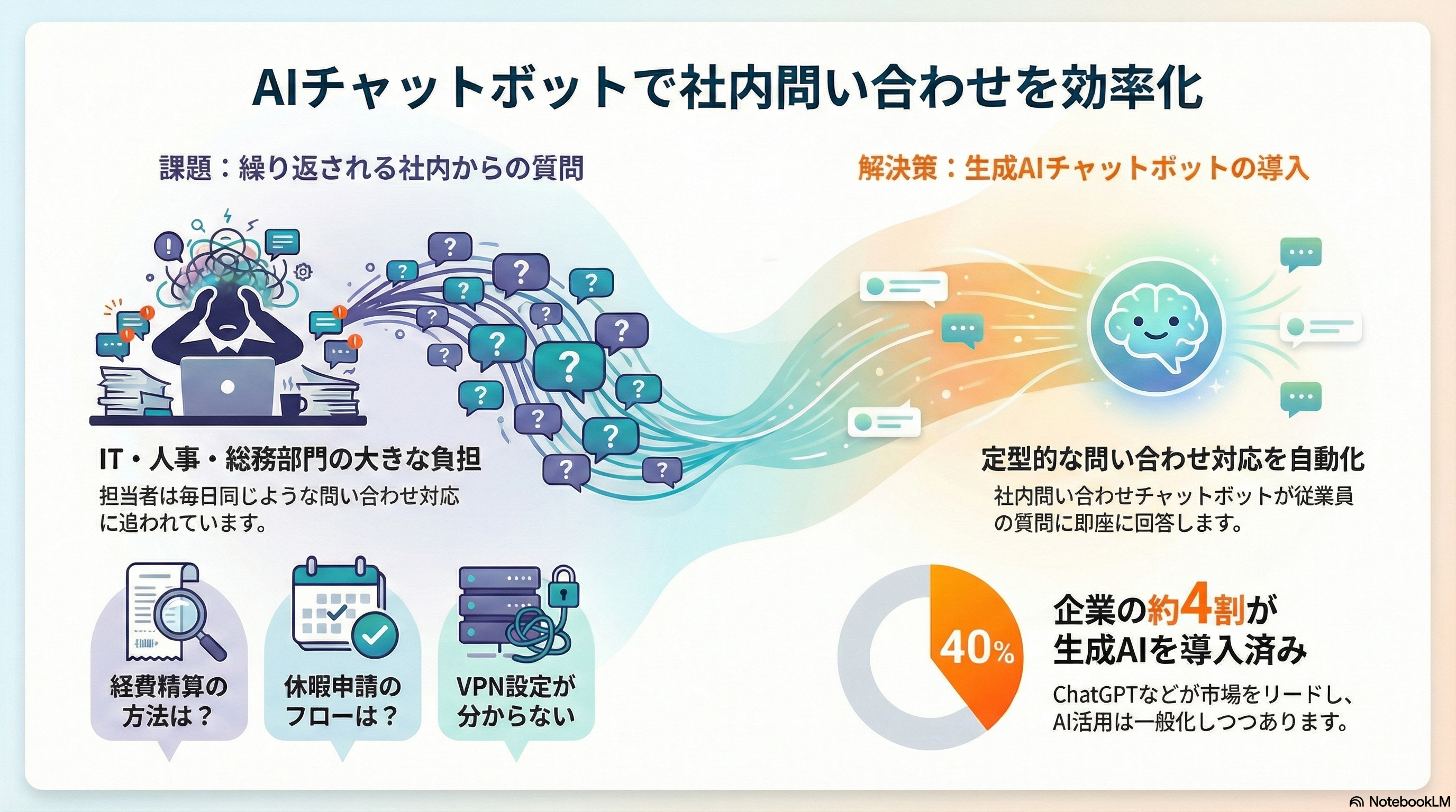 「経費精算の方法を教えてください」「休暇申請のフローは?」「VPNの設定方法が分かりません」——情報システム部門や人事部門、総務部門には、毎日同じような問い合わせが寄せられます。