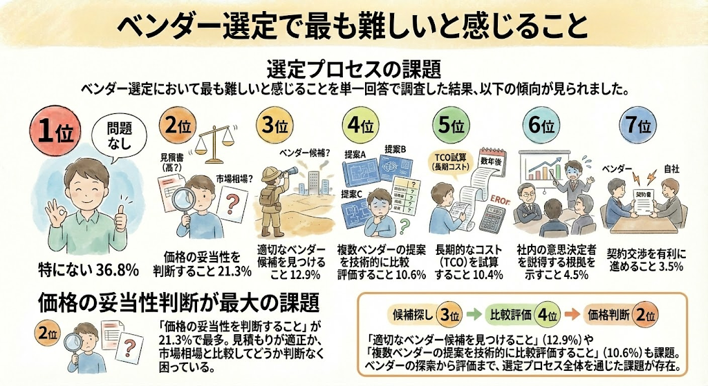 - ベンダー選定で最も難しいのは「価格の妥当性判断」(21.3%)