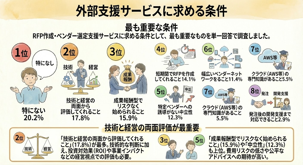具体的な条件として最も多かったのは「技術と経営の両面から評価してくれること」(17.8%)です。システム発注は技術的な判断だけでなく、投資対効果(ROI)や事業インパクトといった経営視点での評価も必要であり、両方の視点を持ったアドバイザーが求められています。