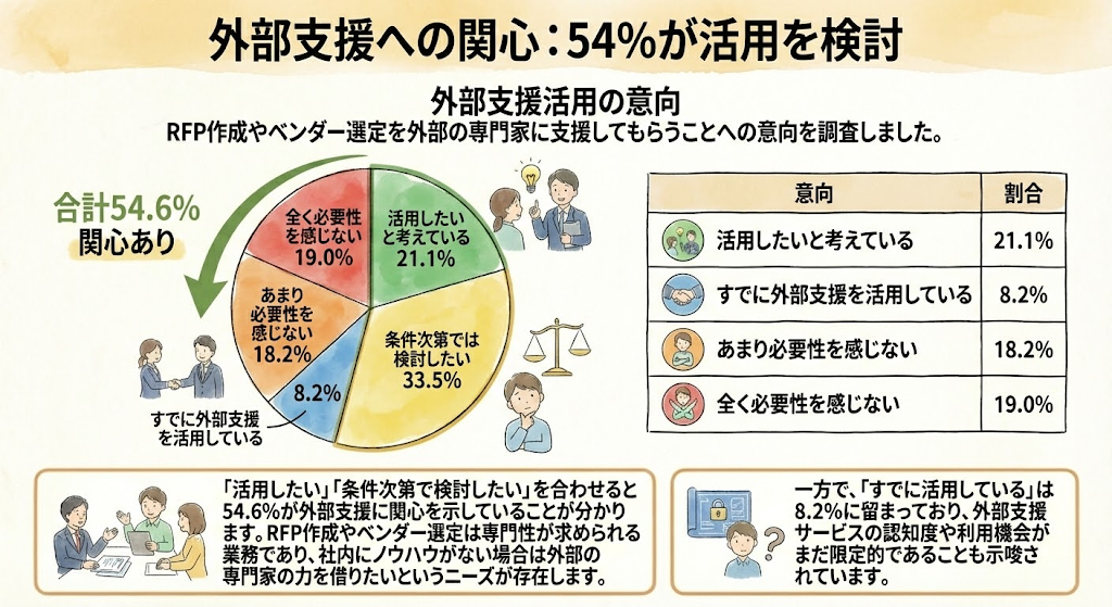 「活用したい」「条件次第で検討したい」を合わせると54.6%が外部支援に関心を示していることが分かります。RFP作成やベンダー選定は専門性が求められる業務であり、社内にノウハウがない場合は外部の専門家の力を借りたいというニーズが存在します。