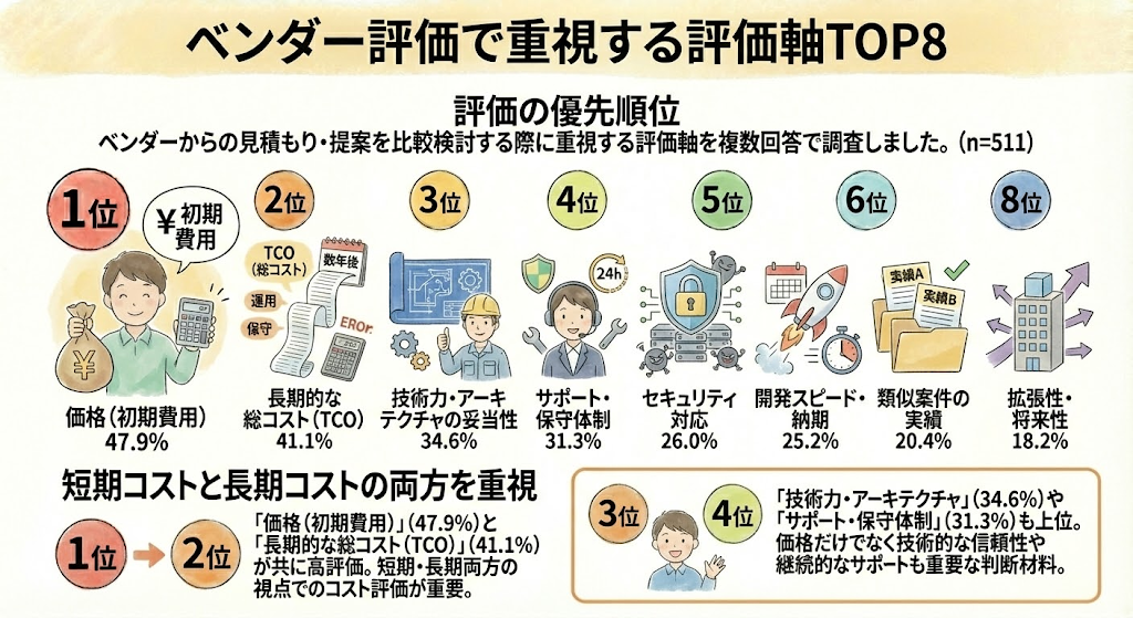 ベンダーからの見積もり・提案を比較検討する際に重視する評価軸を複数回答で調査しました。(n=511)