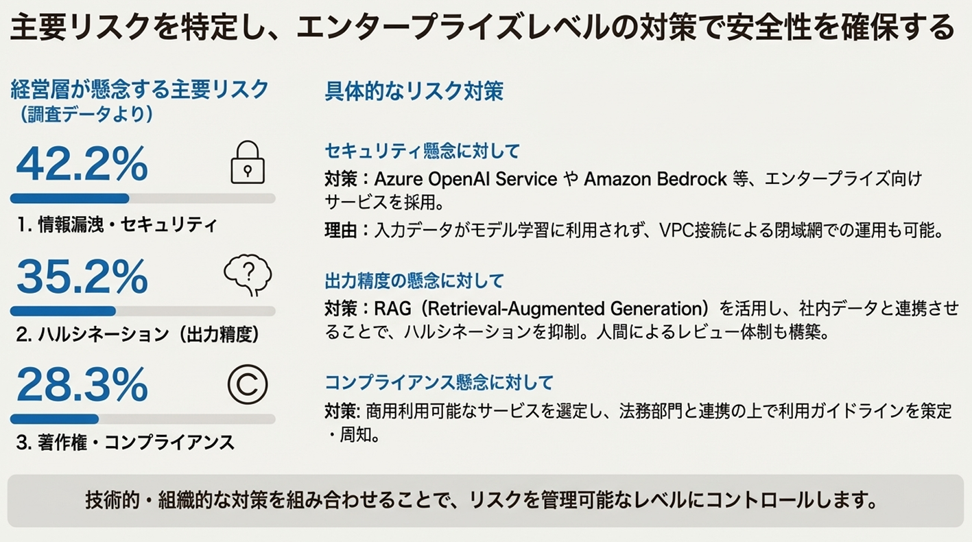 対応 > 「エンタープライズ向けサービス(Azure OpenAI, Amazon Bedrock)では、データの学習利用がなく、VPC接続による閉域運用も可能です。調査では7.5%の企業がAzure OpenAI、6.7%がBedrockを利用しており、セキュリティ要件の厳しい企業でも導入が進んでいます。」