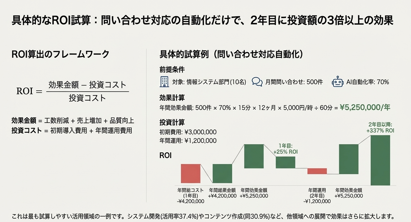 「問い合わせ対応の自動化だけでも、1年目でROI 25%、2年目以降は337%の投資対効果が見込めます。」