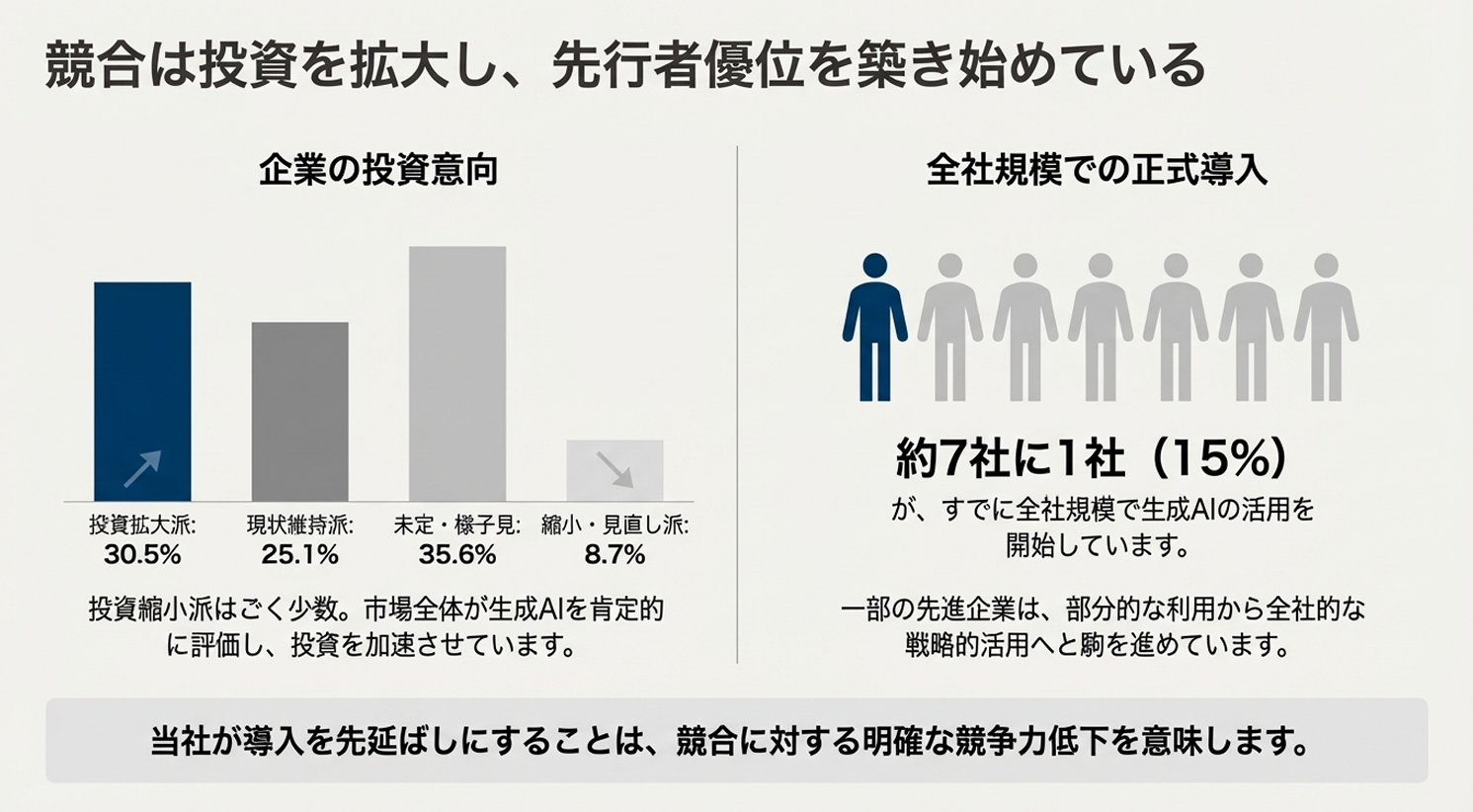 対応 > 「市場データでは52.7%の企業がすでに導入済みであり、30.5%が投資拡大を予定しています。『早い』というより『標準』になりつつあります。様子見を続けることは、競合に対する遅れを意味します。」