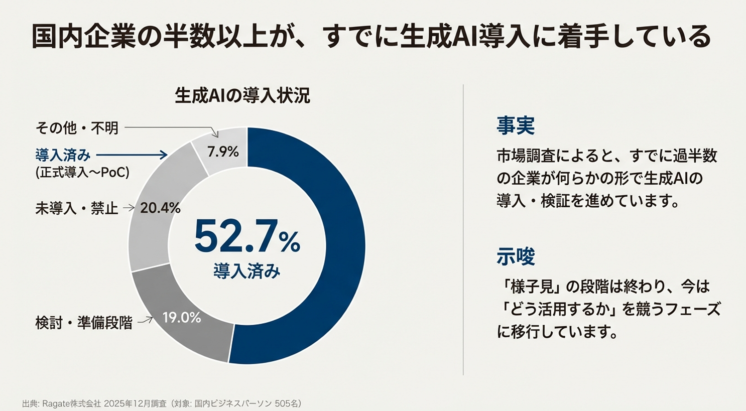 調査データから、約52.7%の企業が何らかの形で生成AIを導入済みであることが分かります。