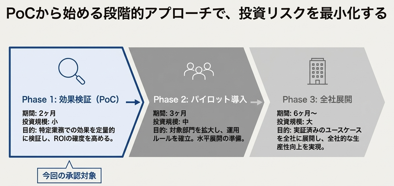 提案時の活用ポイント > 「まずは小規模なPoCから開始し、効果を確認してから本格投資に進む段階的アプローチを提案します。Phase 1の投資は○○万円で、失敗した場合のリスクは限定的です。」