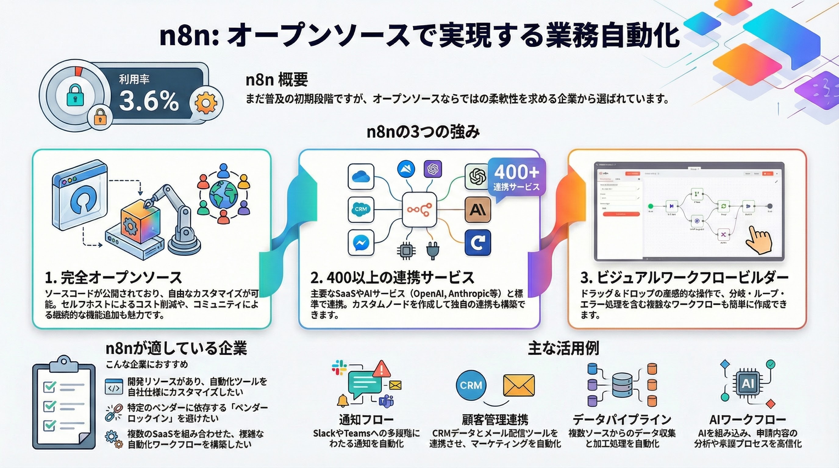 n8nは利用率3.6%と、まだ普及の初期段階ですが、オープンソースの柔軟性を求める企業に選ばれています。