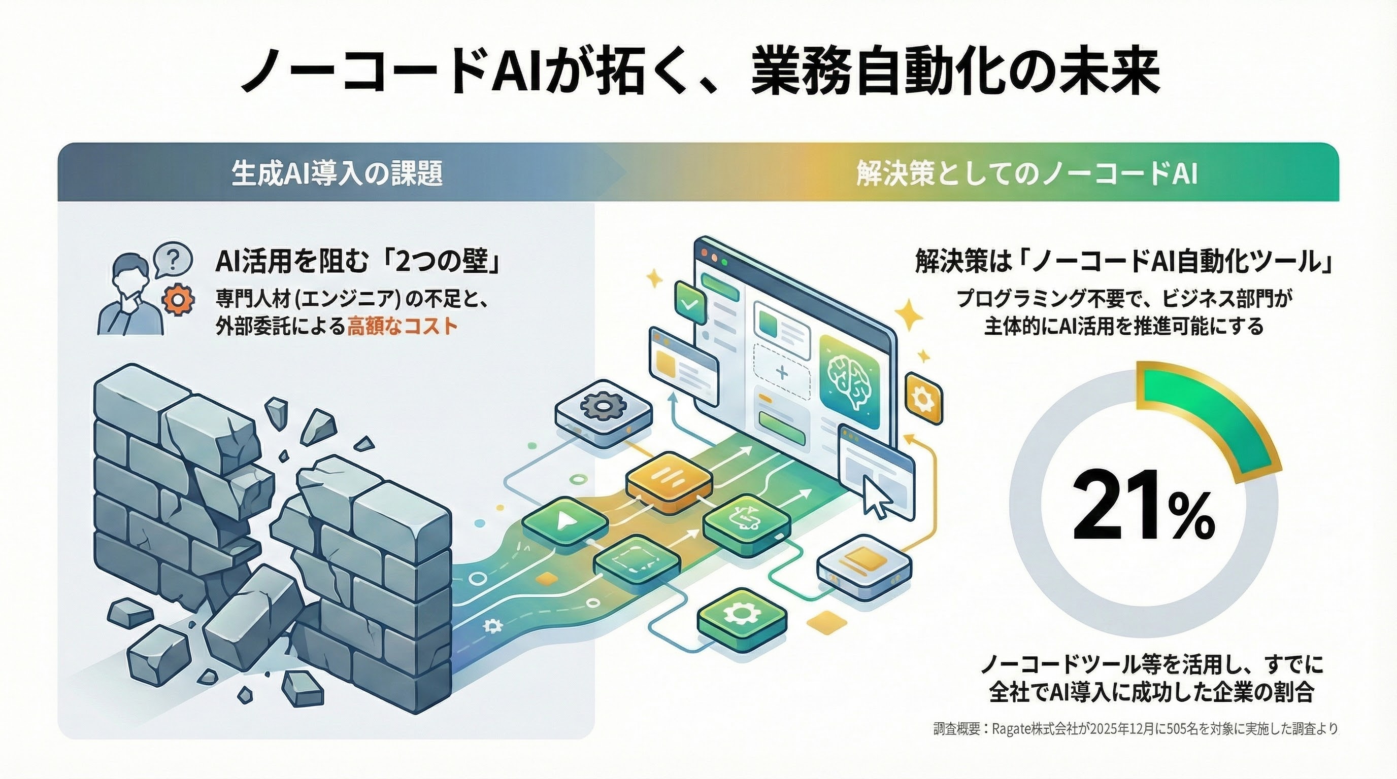 本レポートでは、Ragate株式会社が2025年12月に実施した505名への独自調査から、ノーコードAI自動化ツールの利用実態とツール選定のポイントを詳しく解説します。
