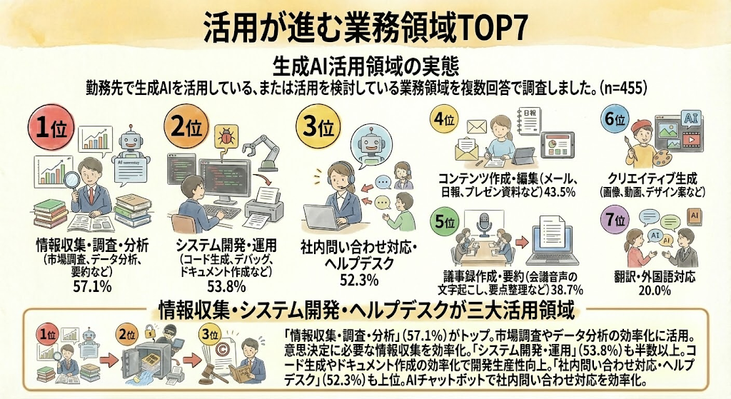 - 活用領域は「情報収集」「システム開発」「ヘルプデスク」がTOP3
