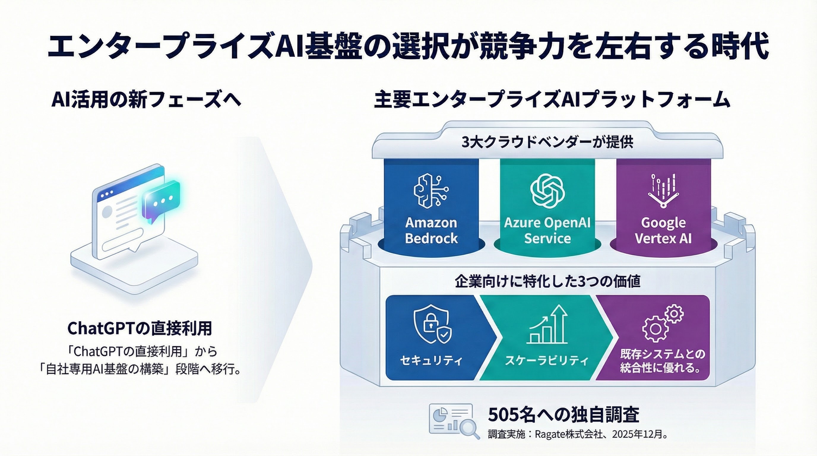本レポートでは、Ragate株式会社が2025年12月に実施した505名への独自調査から、エンタープライズAIプラットフォームの利用実態と選定のポイントを詳しく解説します。