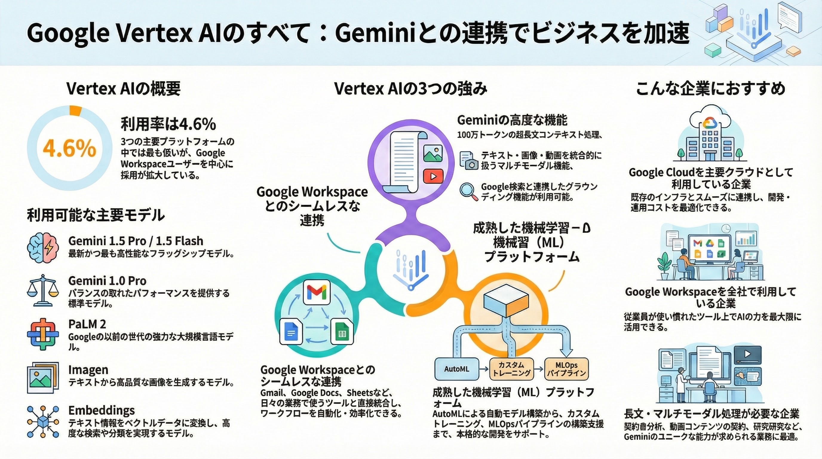 Vertex AIの利用率は4.6%と、3プラットフォームの中では最も低いものの、Google Workspaceユーザーを中心に採用が進んでいます。