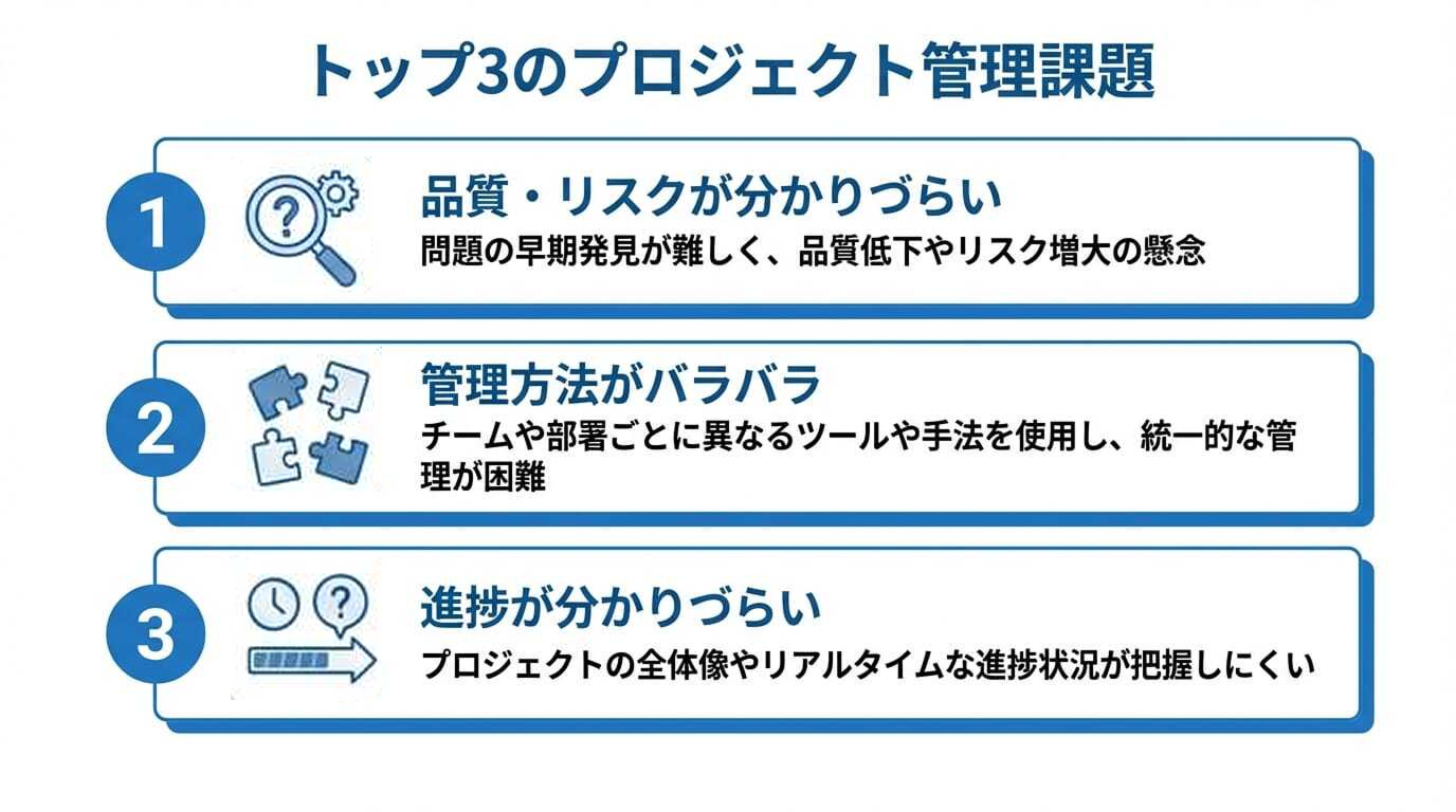 品質・リスクが分かりづらい、管理方法がバラバラ、進捗が分かりづらい。この3つの課題は、まさに私が日々感じていることでもあります。