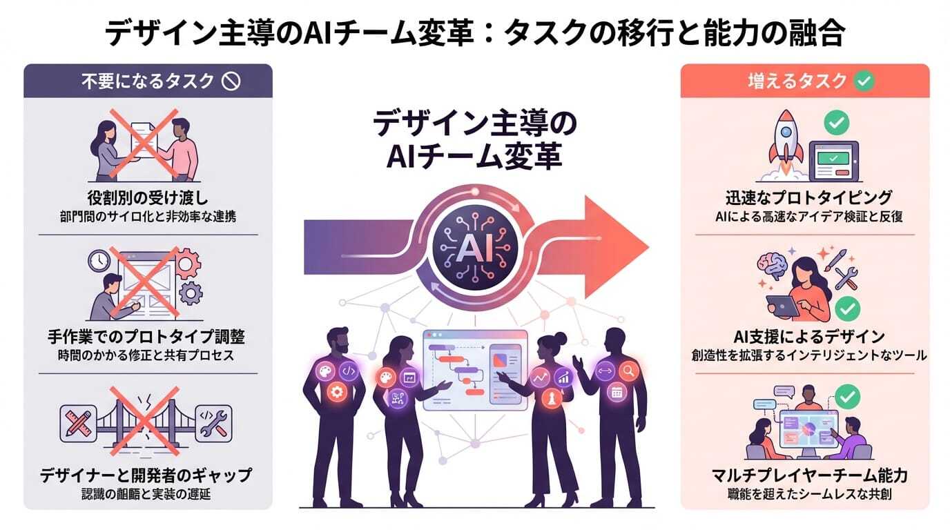 AIを活用することで、デザインと開発の間の連携コストを削減し、チーム全体の生産性を向上できる可能性があります。特に、プロトタイプ段階でのデザイン業務をAIで支援することで、開発チームがより早く、より良いプロトタイプを作成できるようになりそうです。