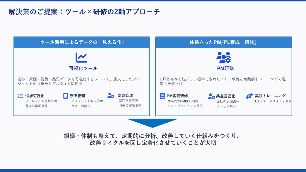 セミナー後、社内でこの話題を共有したところ、同じPMをしている同僚から「ぜひ導入したい」という声が上がりました。AIを活用したデータ可視化ツールの導入を検討し、プロジェクトの状況を定量的に把握できる環境を整備していきます。