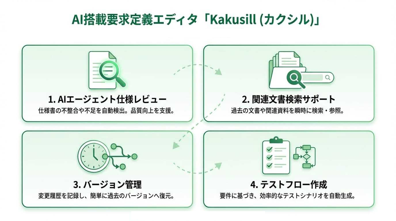 「要件定義は最大の難所」という言葉から始まったプレゼンでした。DX・効率化ツール開発を手がける同社が提供する「Kakusill」は、AI仕様書エディターとして興味深い機能を備えています。