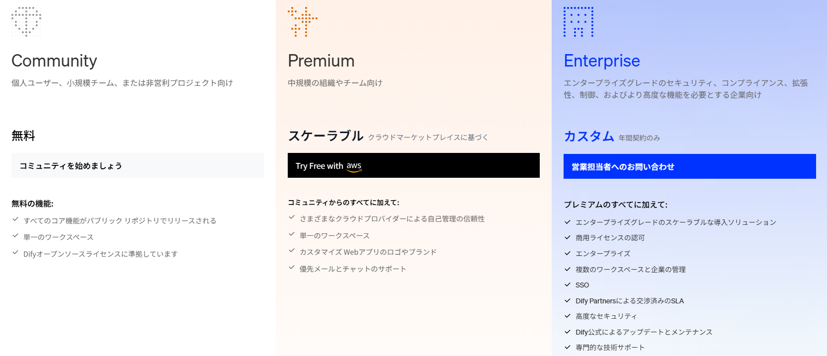 Difyには大きく分けてクラウドサービス(Dify Cloud)とセルフホスト版の2つの提供形態があります。セルフホスト版には無料のCommunity版(OSS版)と有料のPremium、Enterprise版があります。Enterprise版ではSSO(シングルサインオン)やマルチワークスペースなど、企業利用に必要なセキュリティ・ガバナンス機能が提供されています。