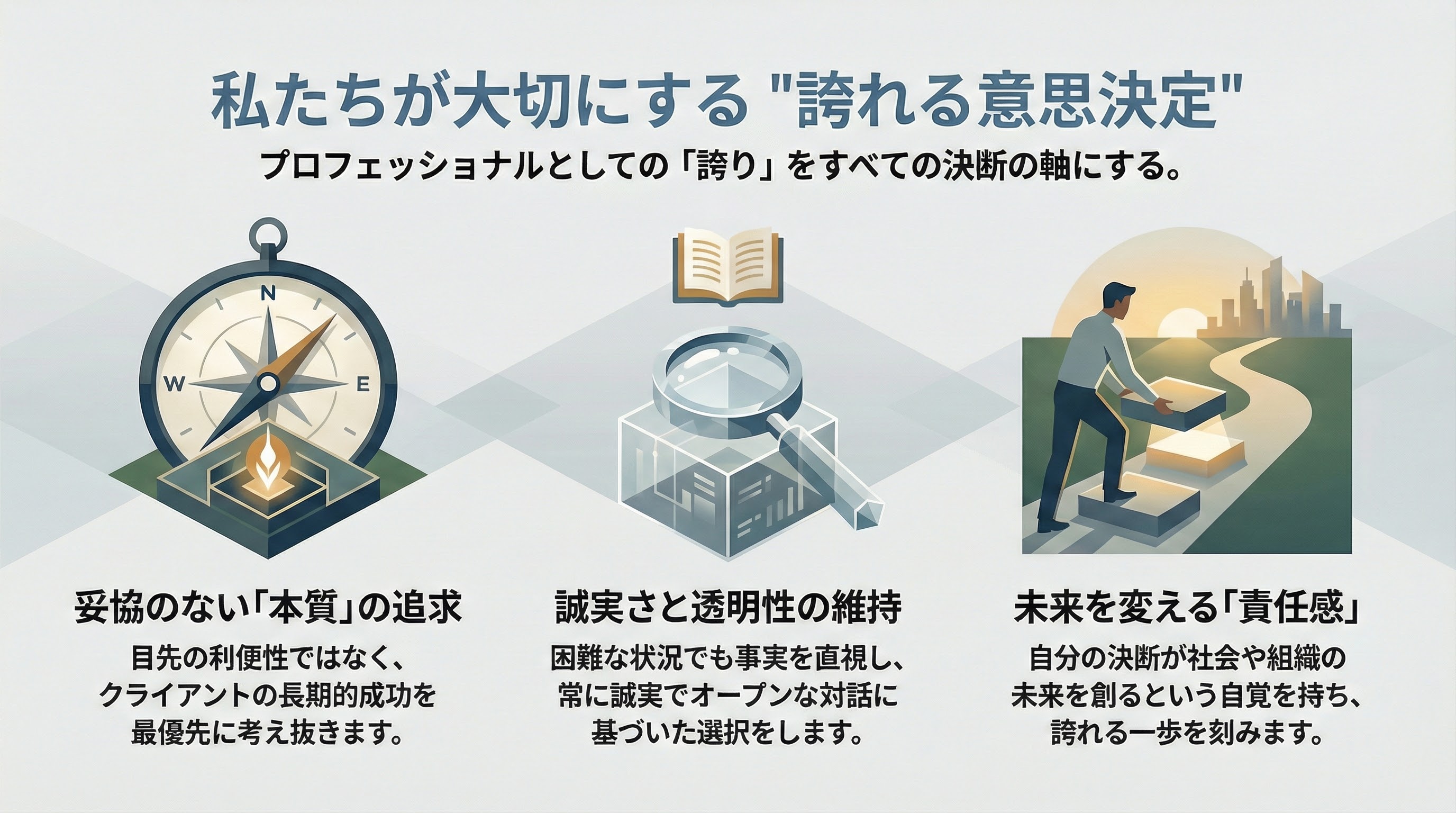 すべての判断基準は「お客様・仲間・未来の自分に胸を張れるか?」という問いから始まります。短期的な利益よりも、長期的な信頼と本質的な価値創造を優先する。