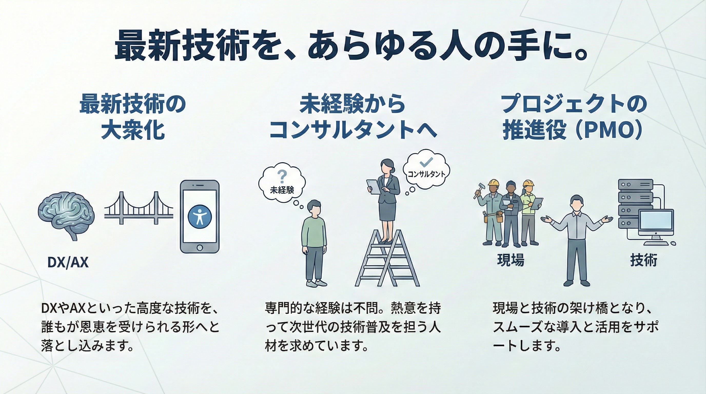 具体的には、お客様のビジネス課題のヒアリングから、IT・DX/AX戦略の立案やAI駆動の業務を導入するためのグランドデザイン策定、そして開発チームと連携してプロジェクトを成功に導くまでの一連のプロセスを推進していただきます。