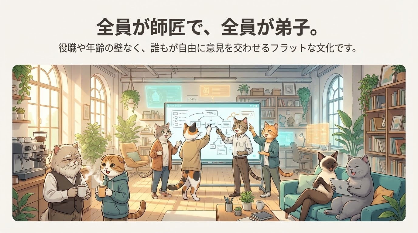 役職や年齢の壁なく、誰もが自由に意見を交わせるフラットな文化。Slackでの技術ディスカッション、定期的な勉強会、ナレッジ共有会など、チーム全体で成長する仕組みが整っています。